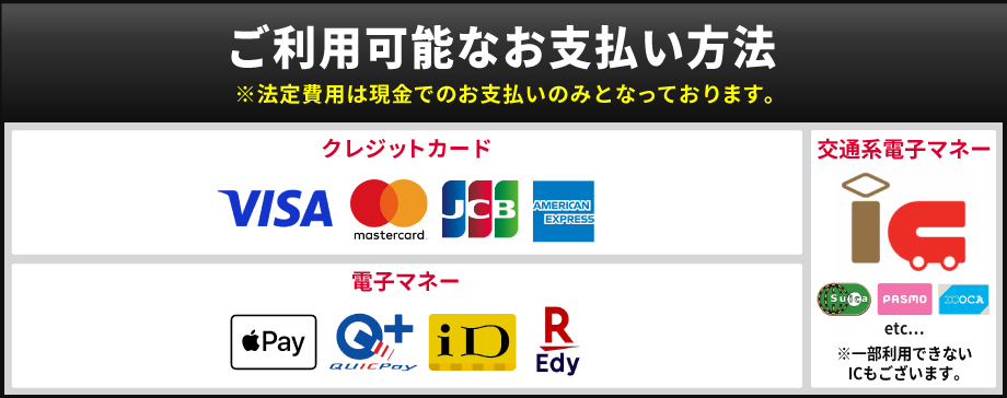 お支払いは現金の他、各種カード、アップルペイ・クイックペイ・iD・交通系IC・楽天Edyもお使いいただけます!
